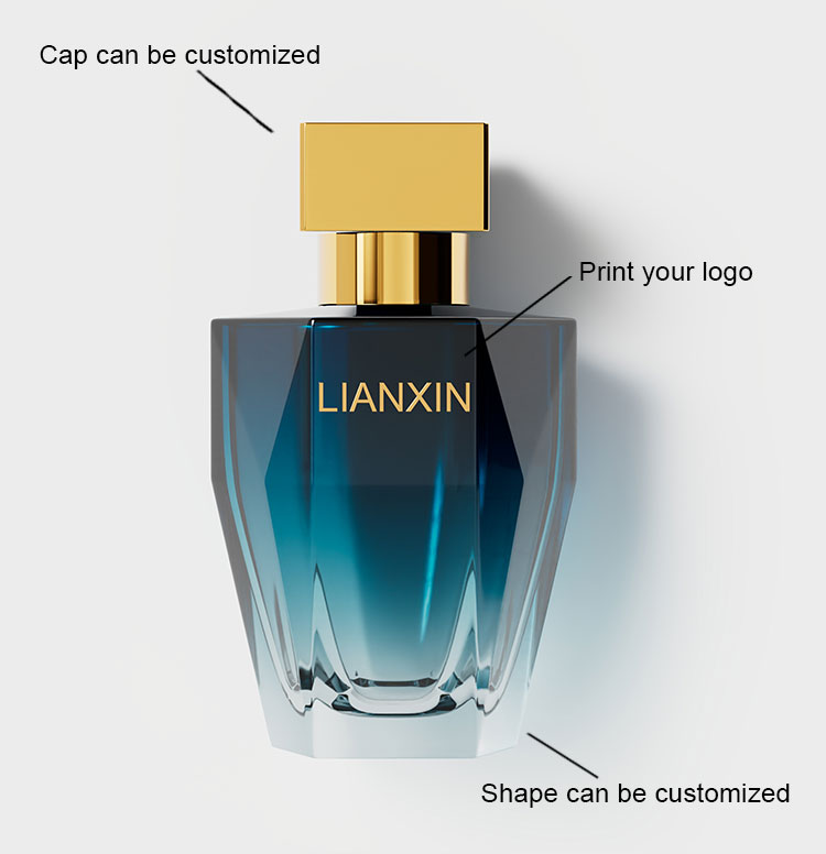 This 50ml perfume bottle is crafted from high-quality transparent glass, featuring a faceted angular design that refracts light to create rich layers of shadow and light. It exudes both a translucent texture and clean, sharp lines.