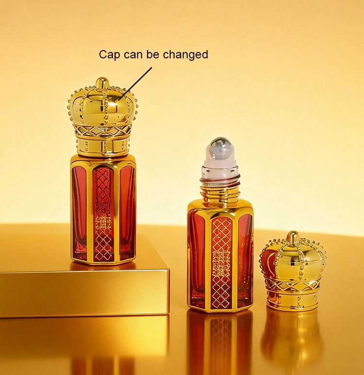 Luxury 6ml Crown Glass Roller Bottle for Essential Oil - Arabic Style Gold Plated Perfume Attar Bottle